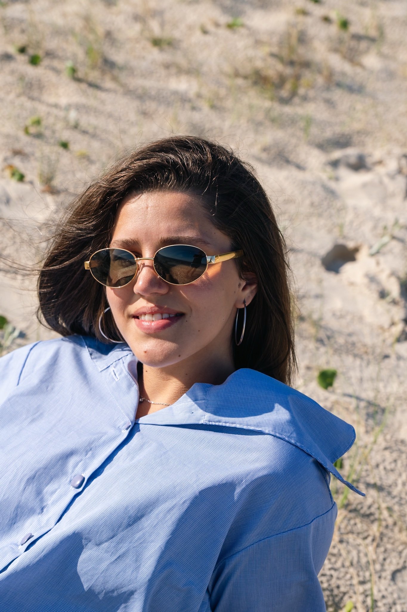 Camisa de tricolina a cuadritos celeste, manga corta. Cuello amplio que cubre hombros y abertura en la espalda con lazo. Liviana, cómoda y fresca.