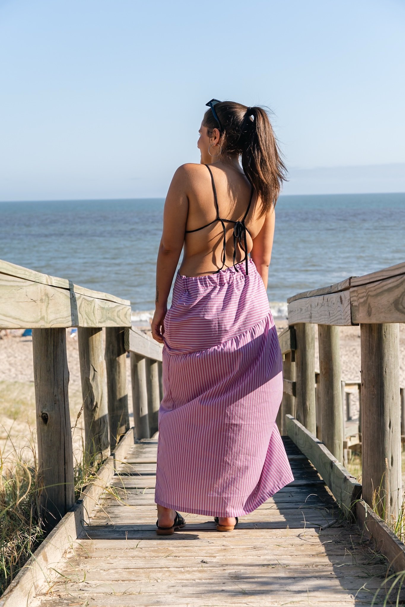 Pollera de tricolina rayda con corte asimétrico en la altura de la cadera, pretina con elástico en la espalda. Cómoda y liviana