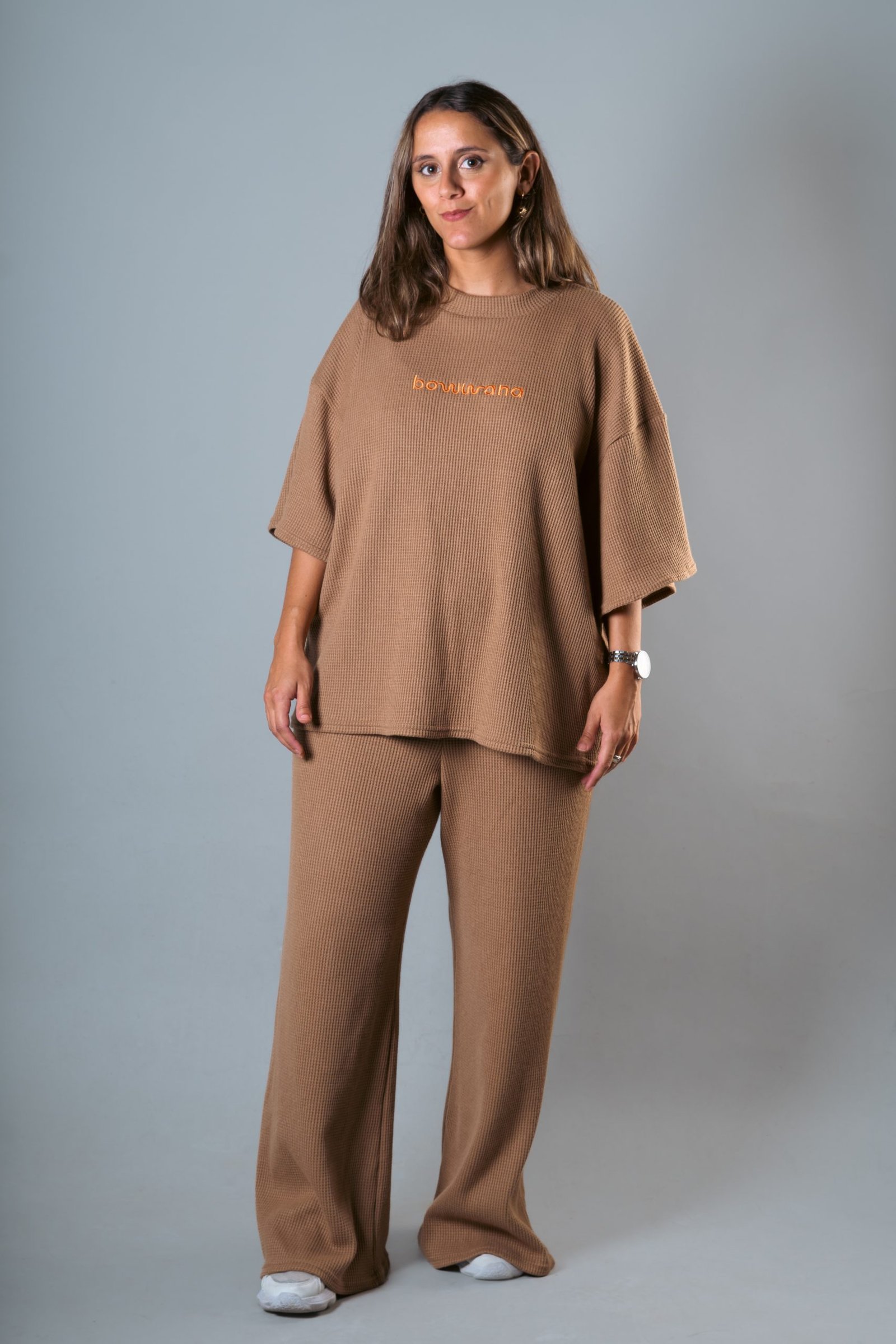 Remera de manga corta confeccionada en punto Prato, con bordado frontal. De calce relajado y textura suave, es la compañera ideal del palazzo Wuff, aunque también brilla por sí sola.