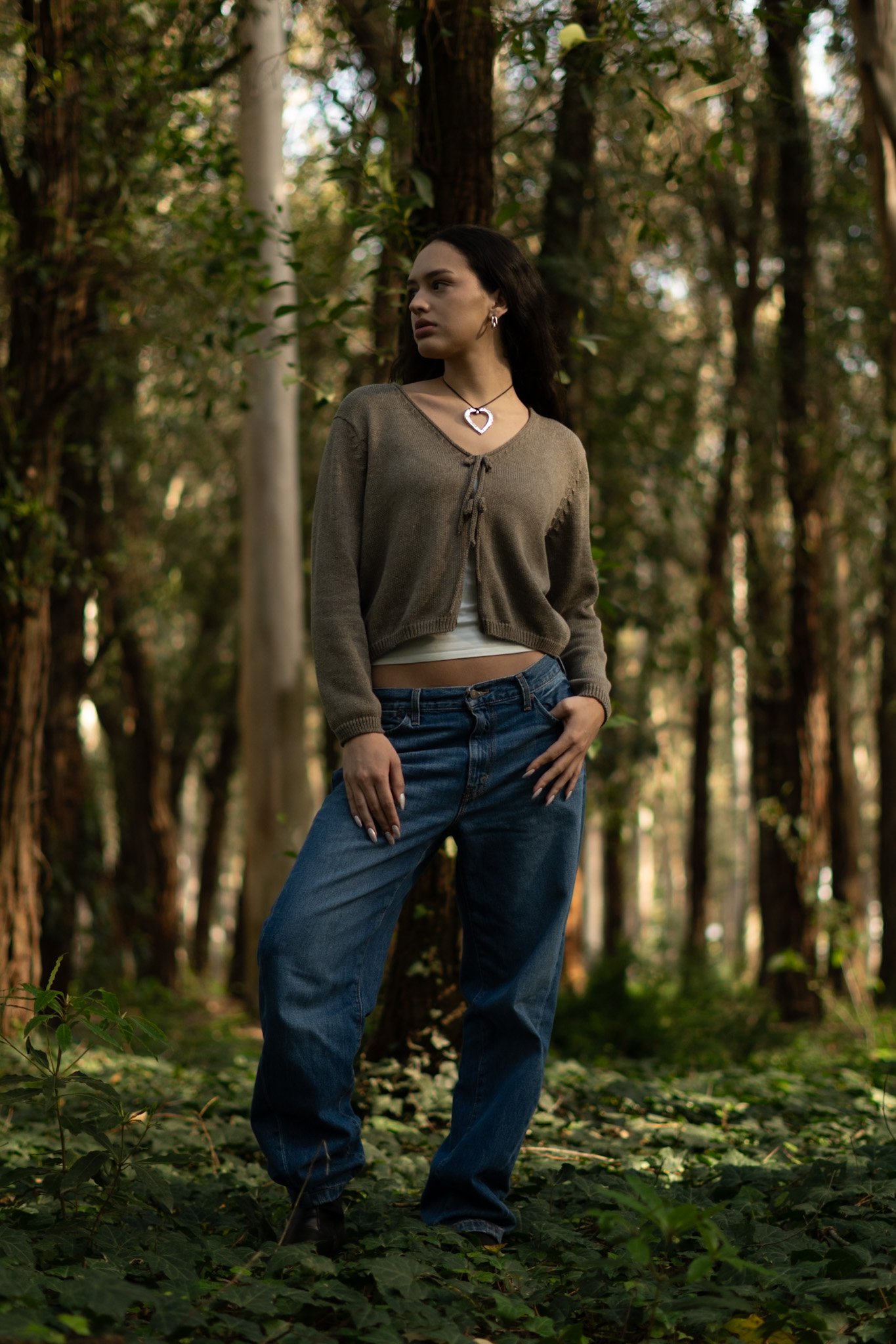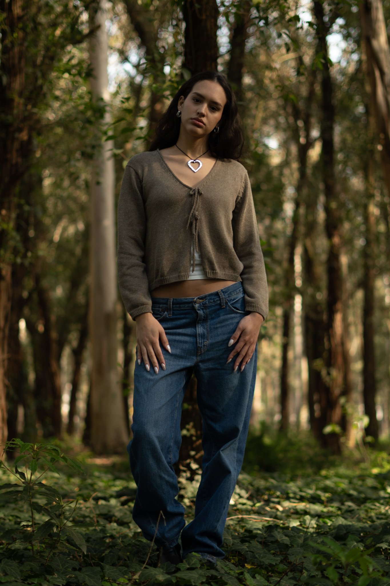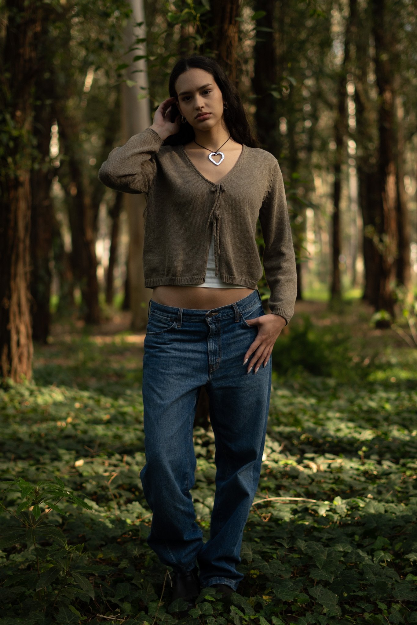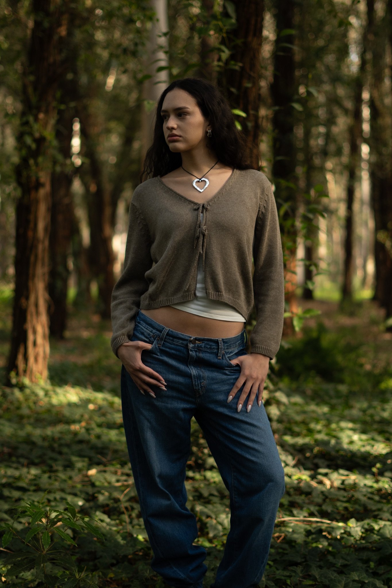 Saco corto tejido con lazos frontales. Suave y delicado.